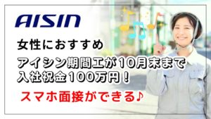 では早速ですが現在、アイシンが期間限定で入社祝い金100万に増額してます!体力に自信のある方、とにかく稼ぎたい方はぜひ!