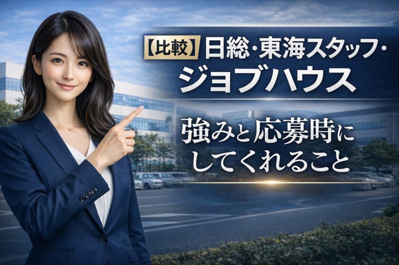 今回は、デンソーやトヨタなど主要メーカーの求人に強い3つの派遣会社「日総工産」「東海スタッフ」「ジョブハウス工場」について、それぞれの特徴と応募時のサポート内容を詳しく解説します!
